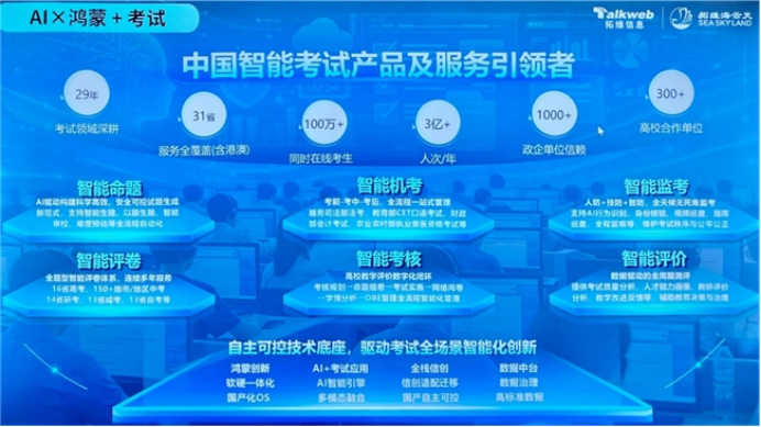 基于鸿蒙创新、软硬一体化、国产化OS、AI智能引擎、全栈信创、数据中台等自主可控技术底座,拓维海云天已实现考试业务全流程数字化重构与数据贯通,保障人才选拔与评价公平公正。